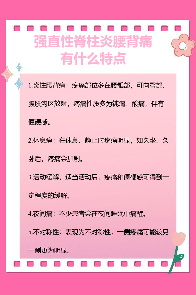 強直性脊柱炎腰背痛特點包括炎性腰背痛、休息痛、活動緩解、夜間痛、不對稱性等。