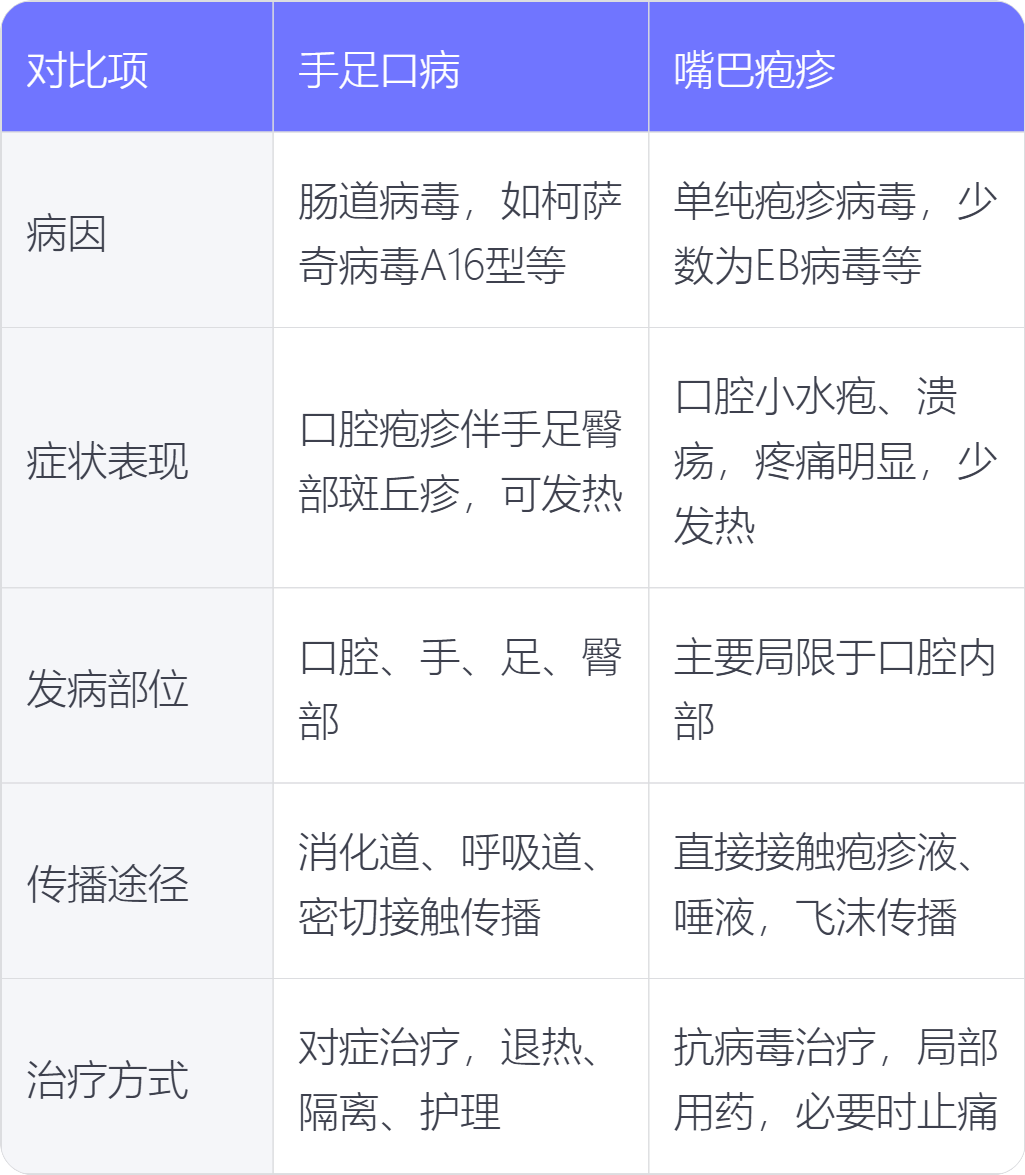手足口病和嘴巴皰疹在病因、症狀表現、發病部位、傳播途徑、治療方式上存在不同。