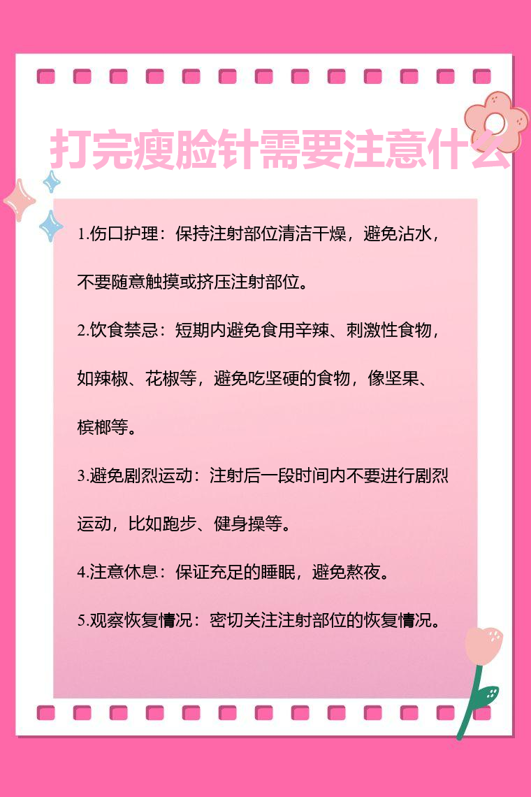 打完瘦臉針需要注意傷口護理、飲食禁忌、避免劇烈運動、注意休息、觀察恢復情況等。