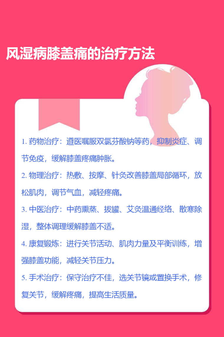 風濕病膝蓋痛的治療方法包括藥物治療、物理治療、中醫治療、康復鍛鍊、手術治療等。