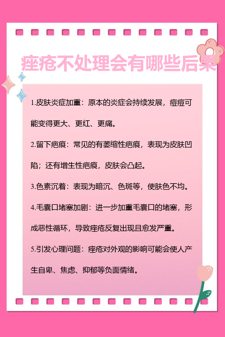 痤瘡不處理可能出現皮膚炎症加重、留下疤痕、色素沈著、毛囊口堵塞加劇、引發心理問題等。