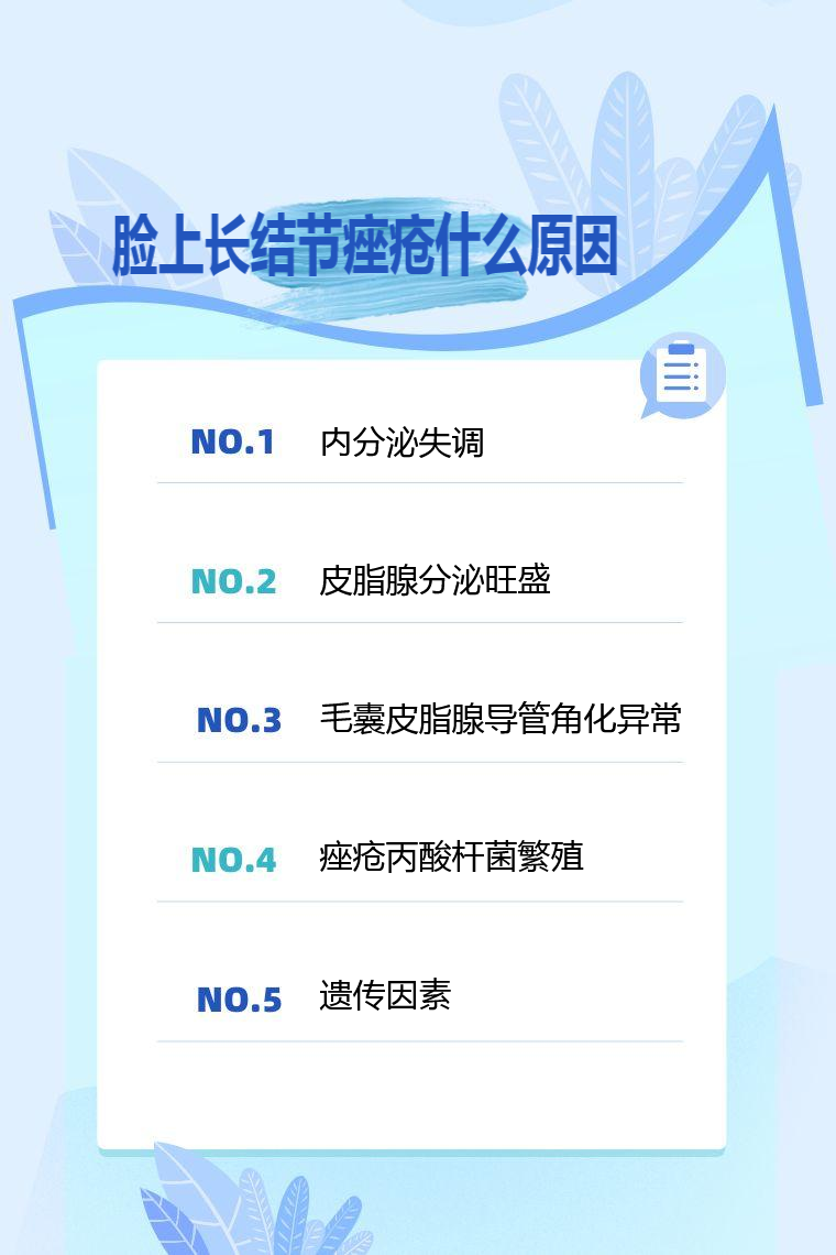 臉上長結節痤瘡的原因包括內分泌失調、皮脂腺分泌旺盛、毛囊皮脂腺導管角化異常、痤瘡丙酸桿菌繁殖、遺傳因素等。