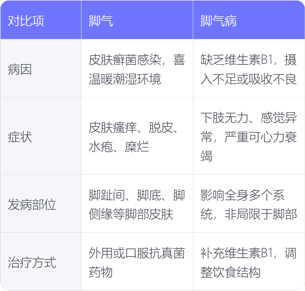 1. 病因:腳氣是由皮膚癬菌感染引起的,這類真菌喜好溫暖潮濕環境,易在腳部滋生。而腳氣病主要因缺乏維生素B1導致,飲食中維生素B1攝入不足、吸收不良等都可能引發。