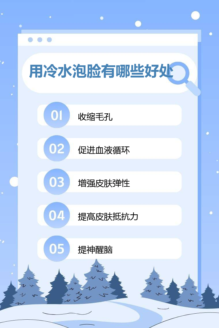 用冷水泡臉具有收縮毛孔、促進血液循環、增強皮膚彈性、提高皮膚抵抗力、提神醒腦等好處。