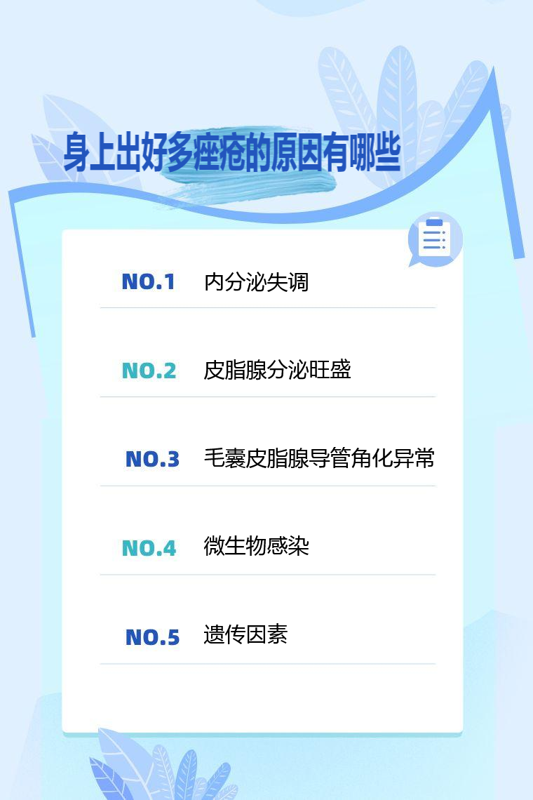 身上出好多痤瘡的原因有內分泌失調、皮脂腺分泌旺盛、毛囊皮脂腺導管角化異常、微生物感染、遺傳因素等。