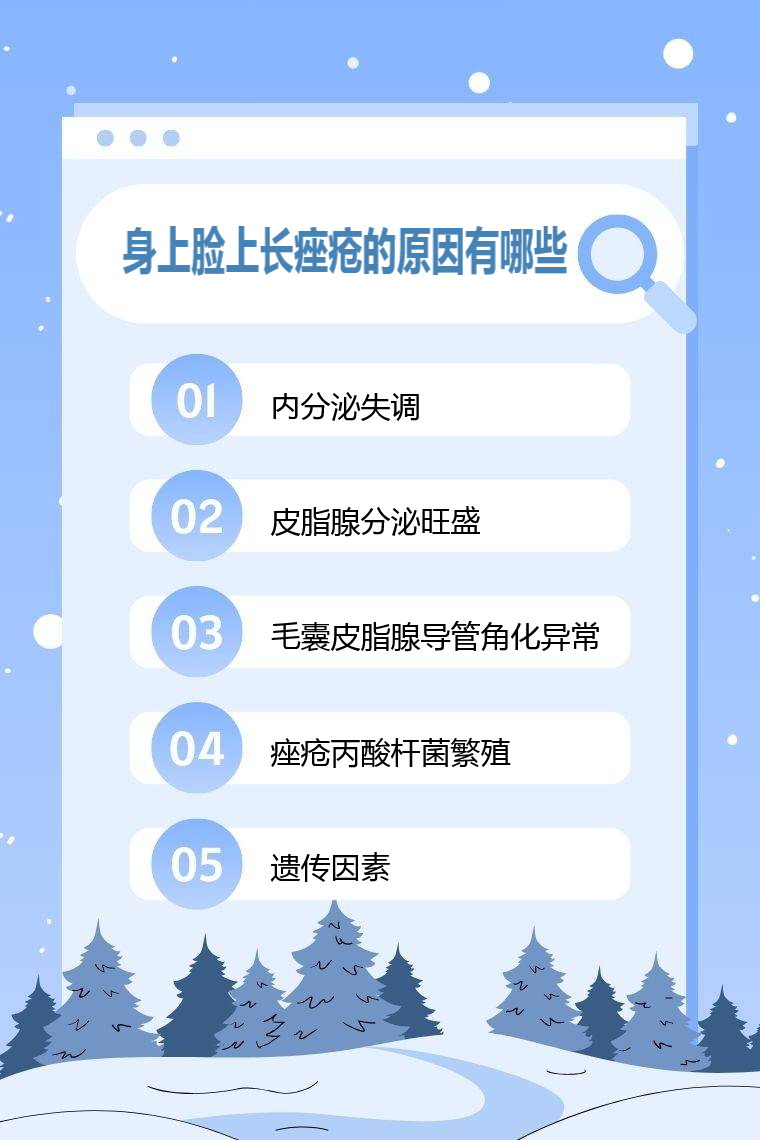 身上臉上長痤瘡的原因有內分泌失調、皮脂腺分泌旺盛、毛囊皮脂腺導管角化異常、痤瘡丙酸桿菌繁殖、遺傳因素等。