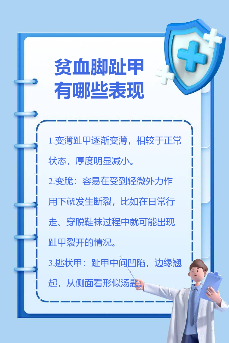 貧血時腳趾甲可能出現變薄、變脆、匙狀甲等表現。