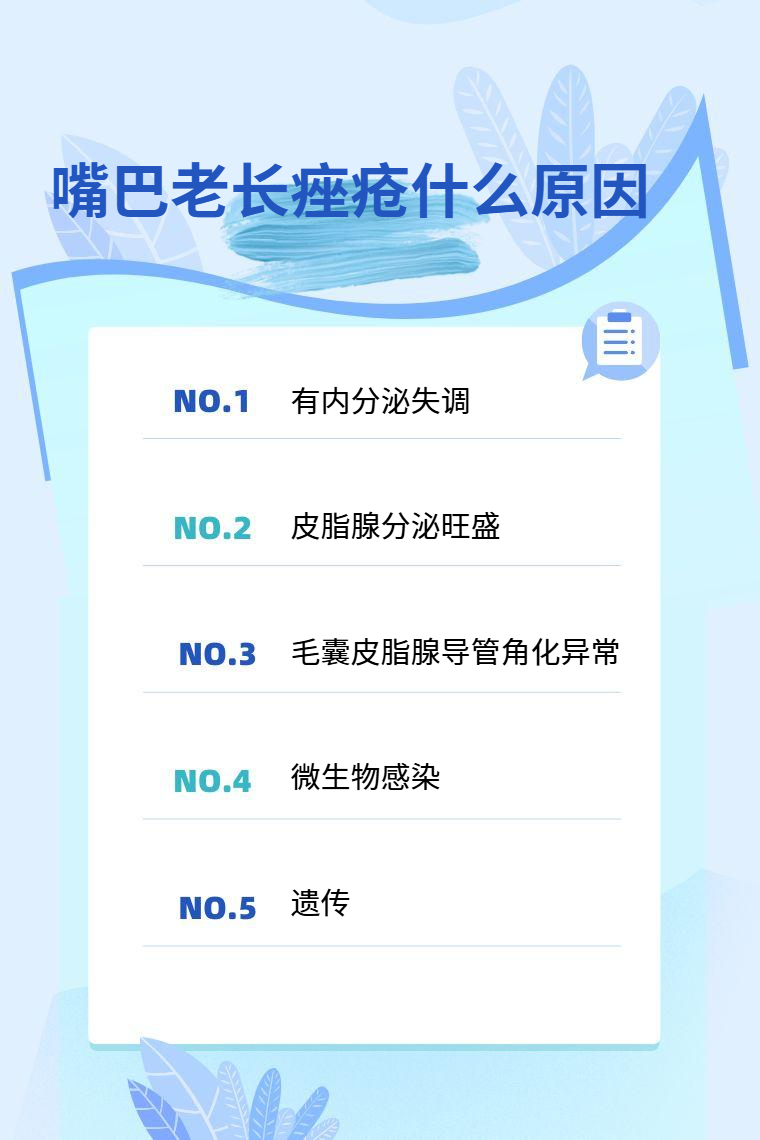嘴巴老長痤瘡常見原因有內分泌失調、皮脂腺分泌旺盛、毛囊皮脂腺導管角化異常、微生物感染、遺傳等。