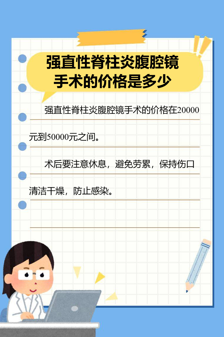 強直性脊柱炎腹腔鏡手術的價格在20000元到50000元之間,存在個體差異性。影響費用的因素有病情嚴重程度、手術複雜程度、地區差異、耗材使用 、術後恢復情況等。