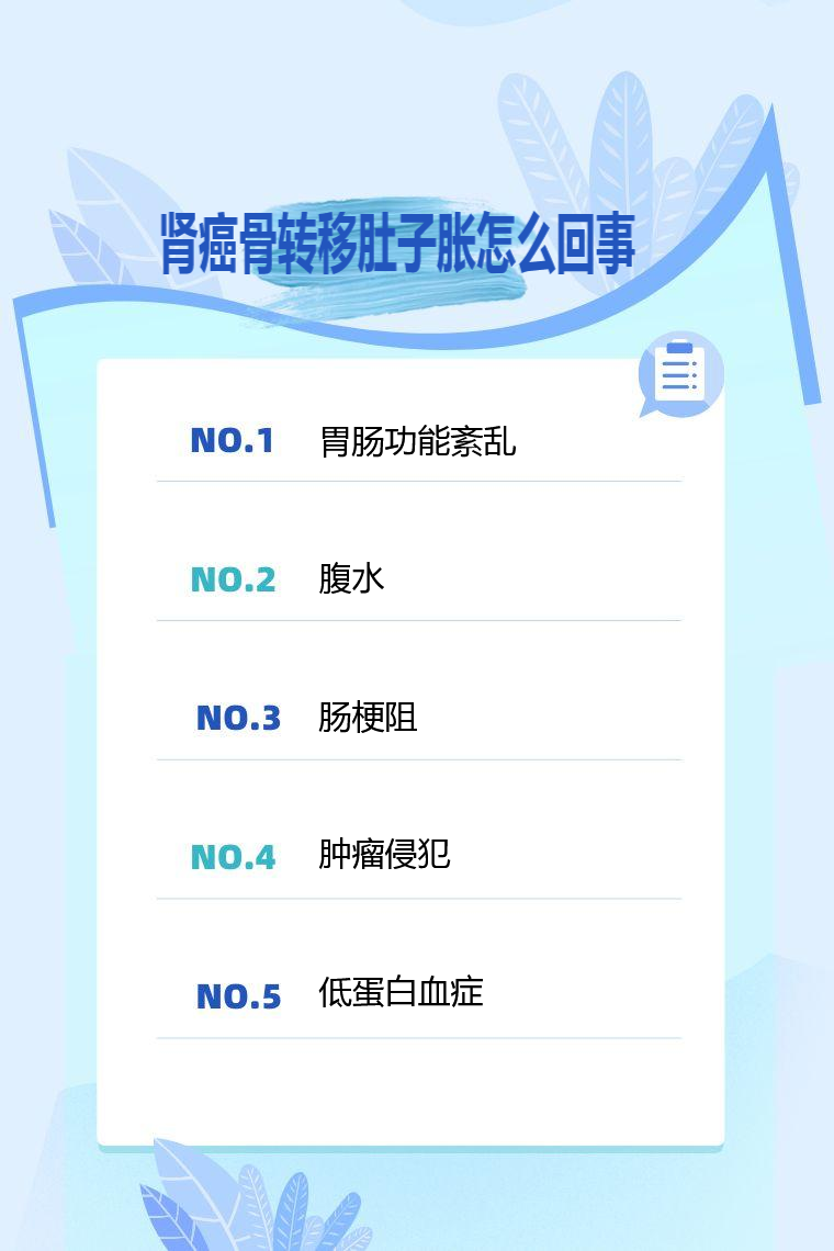 4. 腫瘤侵犯:腎癌骨轉移灶可能侵犯腹部周圍組織器官,壓迫周圍血管、神經和胃腸道,影響其正常功能,造成肚子脹。