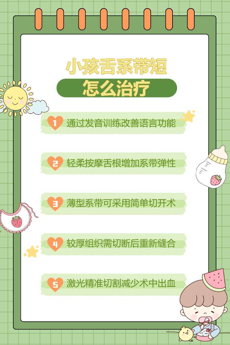 小孩舌系帶短的治療方法有語音訓練、按摩、舌系帶切開術、舌系帶延長術、激光手術等。