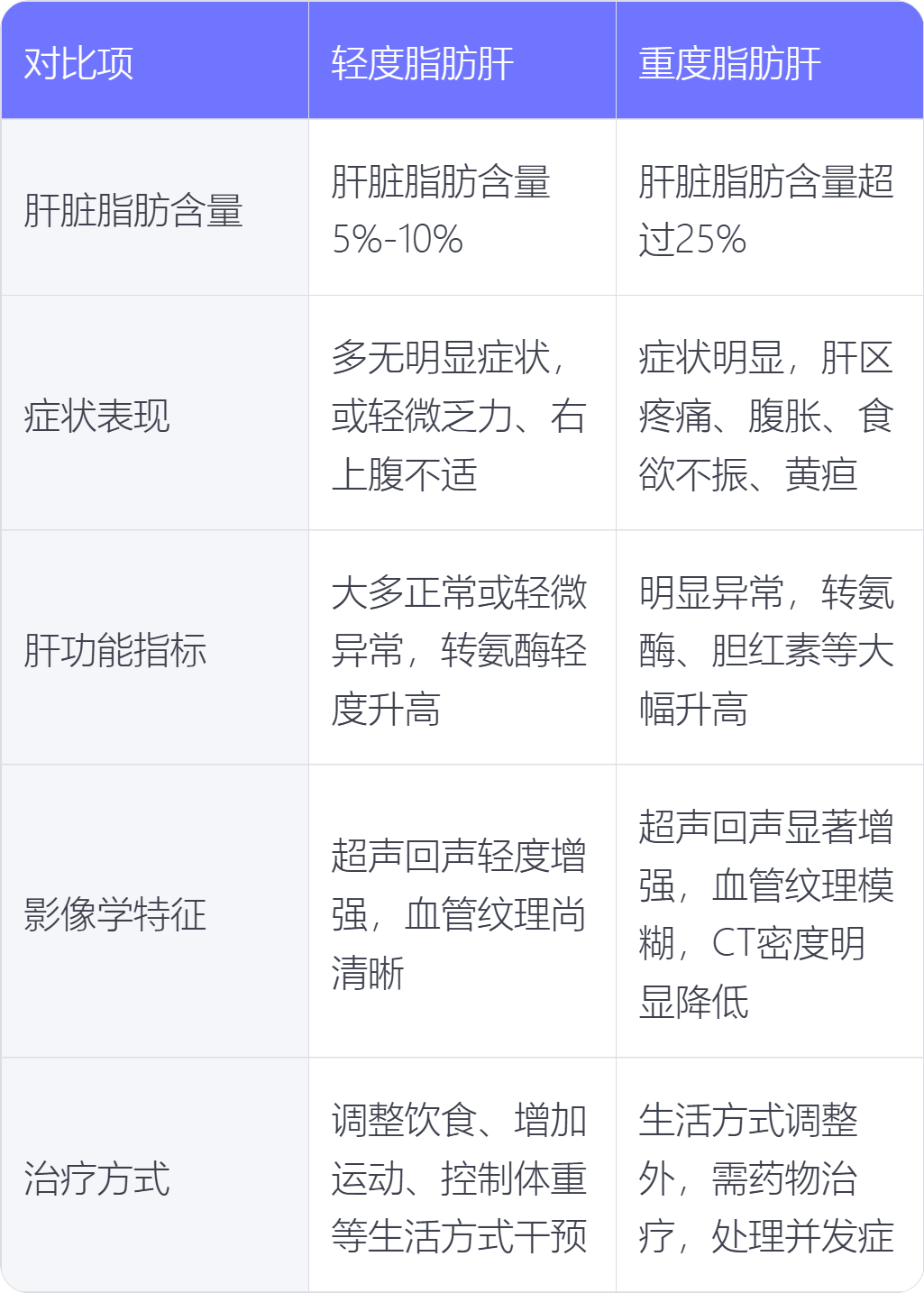 脂肪肝可通過肝臟脂肪含量、症狀表現、肝功能指標、影像學特徵、治療方式來區別輕度或重度。