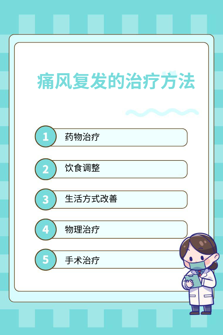 痛風復發的治療方法主要有藥物治療、飲食調整、生活方式改善、物理治療、手術治療等。