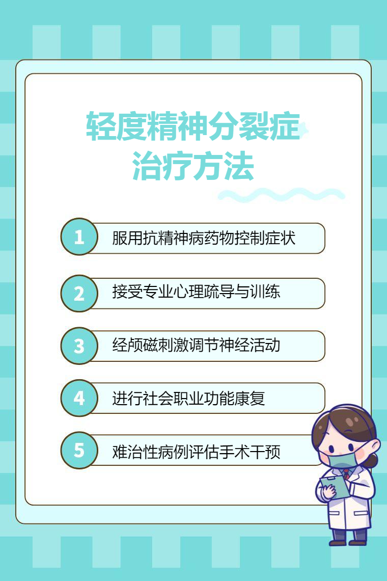輕度精神分裂症的治療方法主要有藥物治療、心理治療、物理治療、康復治療、手術治療等。