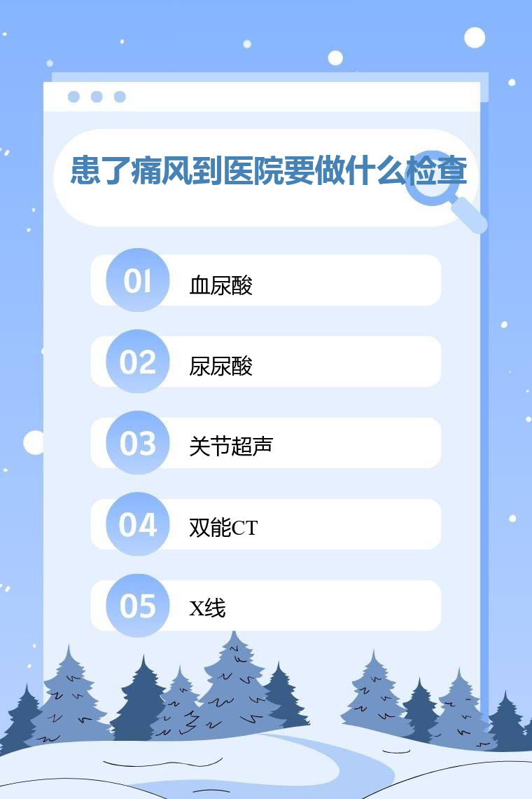 痛風到醫院要做血尿酸、尿尿酸、關節超聲、雙能CT、X線等檢查。