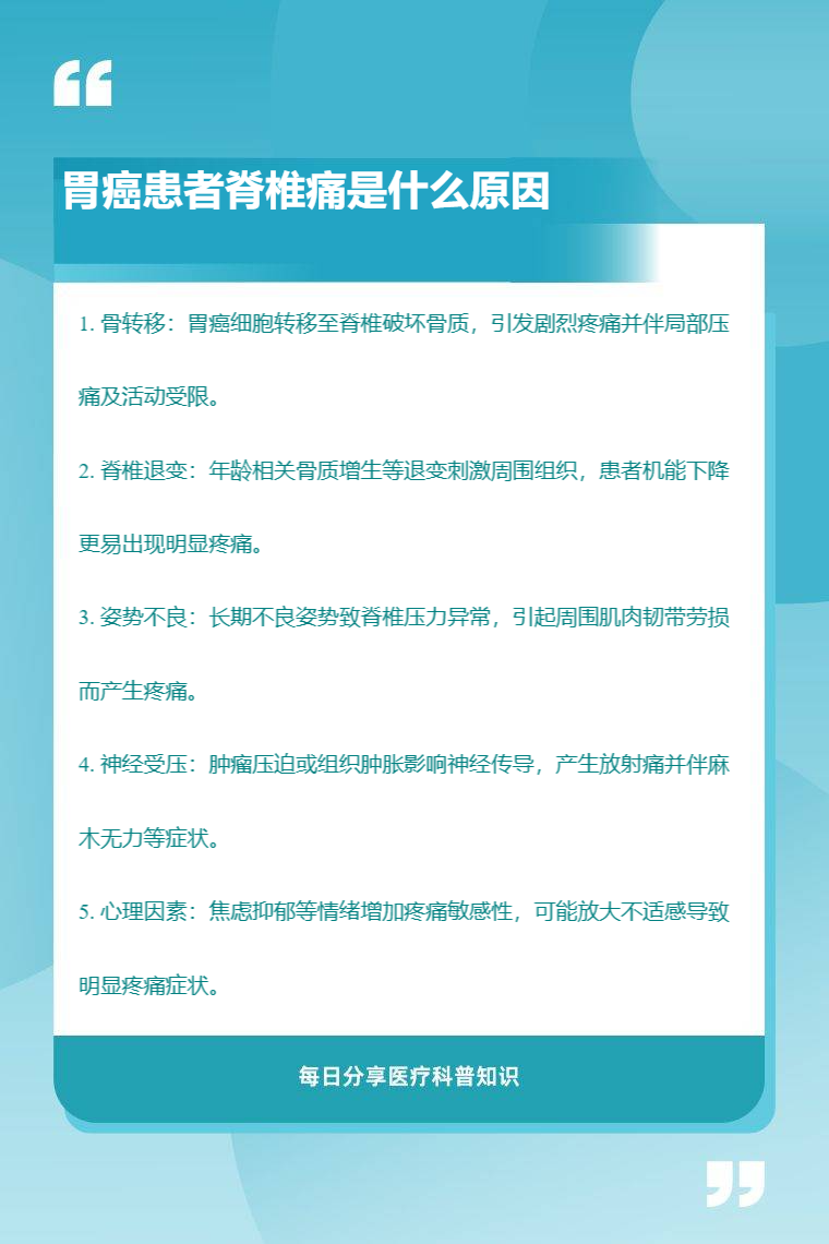胃癌患者脊椎痛的原因可能是骨轉移、脊椎退變、姿勢不良、神經受壓、心理因素等。