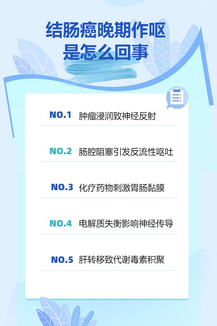 結腸癌晚期作嘔可能由腫瘤侵犯、腸梗阻、化療副作用、電解質紊亂、肝轉移等情況引起。