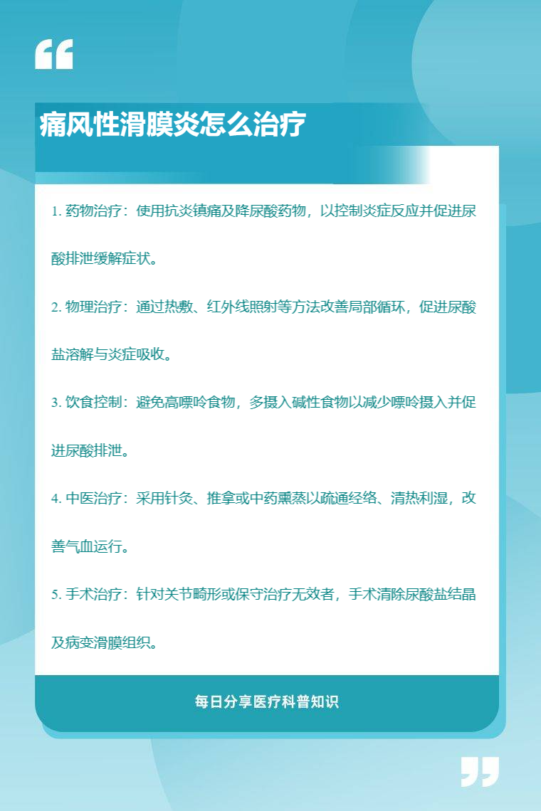 痛風性滑膜炎的治療方法主要有藥物治療、物理治療、飲食控制、中醫治療、手術治療等。