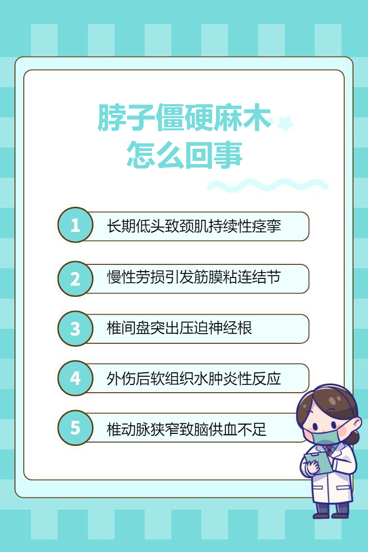 脖子僵硬麻木可能是頸部姿勢不良、頸部肌肉勞損、頸椎病、頸部外傷、頸部血管病變等因素,需要針對病因治療。