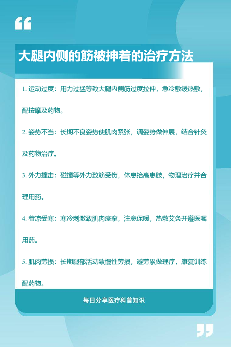 大腿內側的筋被抻著可能是運動過度、姿勢不當、外力撞擊、著涼受寒、肌肉勞損等因素,需要針對病因治療,可採取的方法有物理治療、藥物治療等。