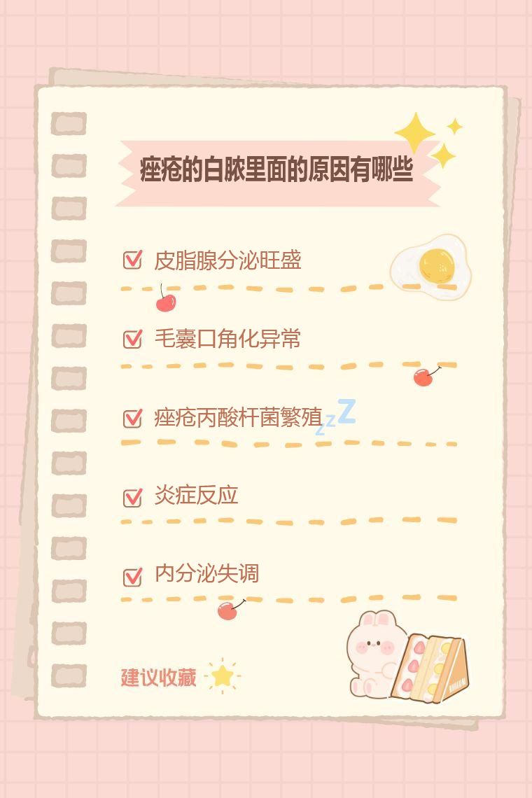 痤瘡白膿裡面的原因有皮脂腺分泌旺盛、毛囊口角化異常、痤瘡丙酸桿菌繁殖、炎症反應、內分泌失調等。