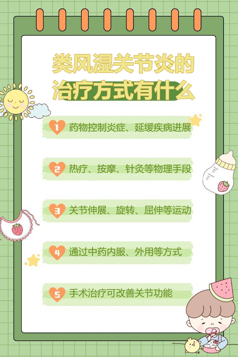 類風濕關節炎的治療方式有藥物治療、物理治療、康復訓練、中醫治療、手術治療等。