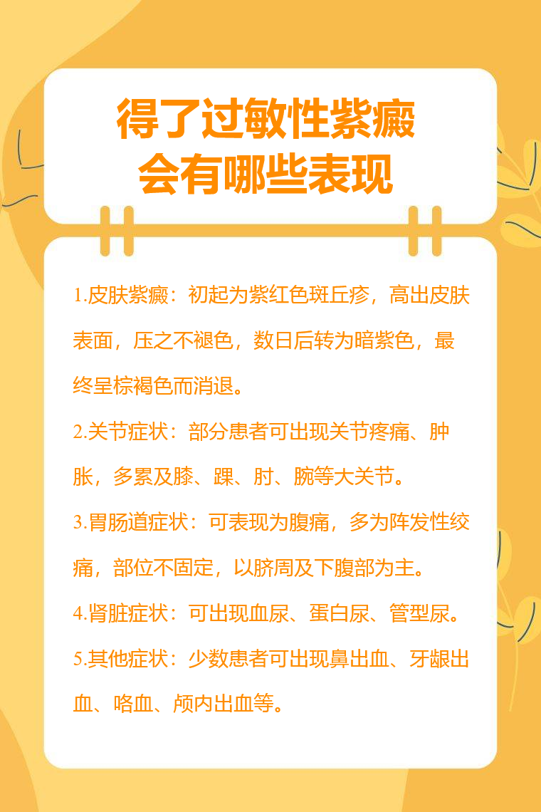 過敏性紫癜的表現有皮膚紫癜、關節症狀、胃腸道症狀、腎臟症狀、其他症狀等。