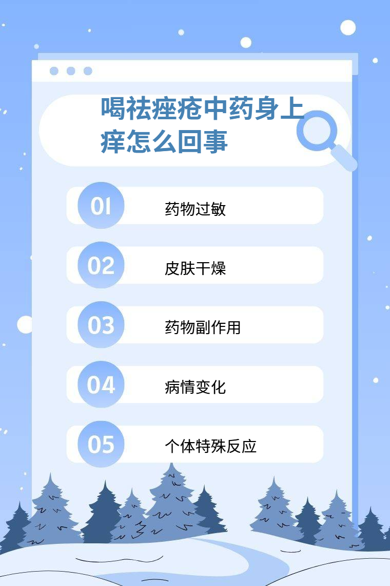 喝祛痤瘡中藥身上癢可能是藥物過敏、皮膚乾燥、藥物副作用、病情變化、個體特殊反應等。