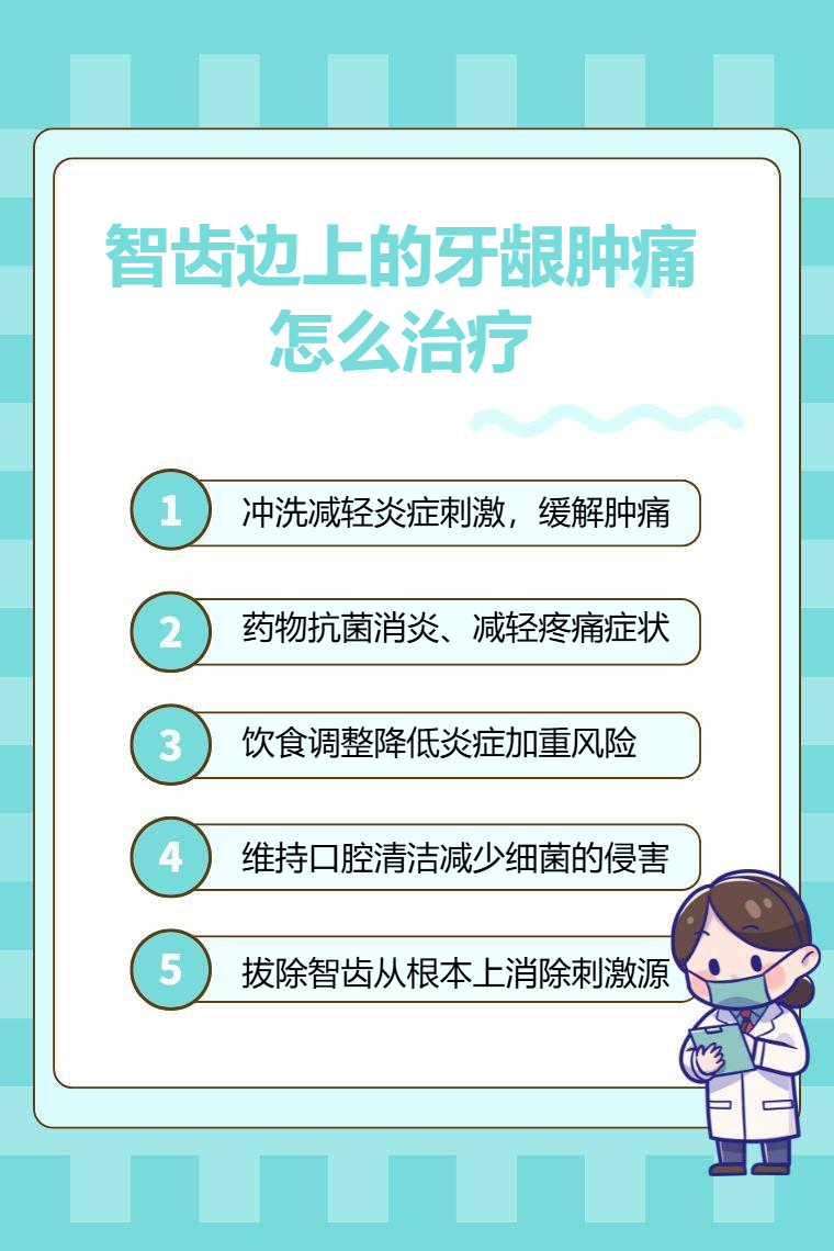 智齒邊上的牙齦腫痛可通過局部沖洗、藥物治療、飲食調整、口腔清潔、手術治療等方法緩解。