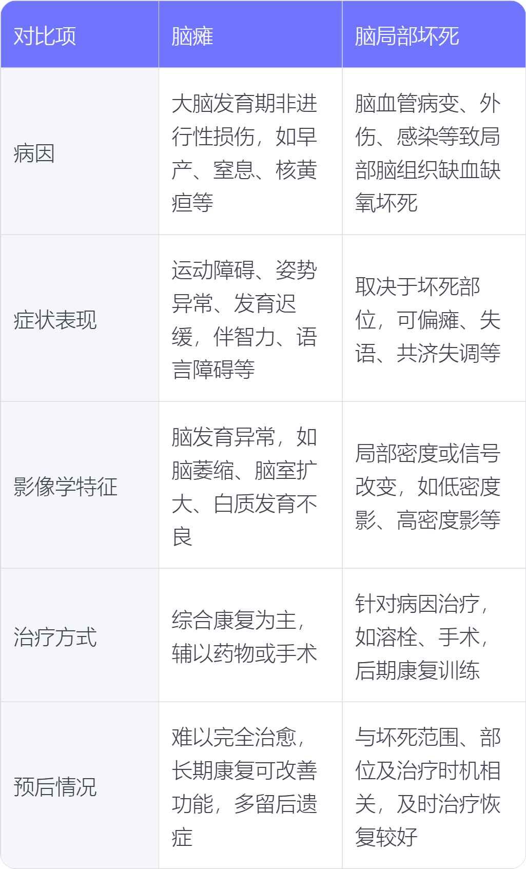 腦癱和腦局部壞死在病因、症狀表現、影像學特徵、治療方式、預後情況上存在不同。