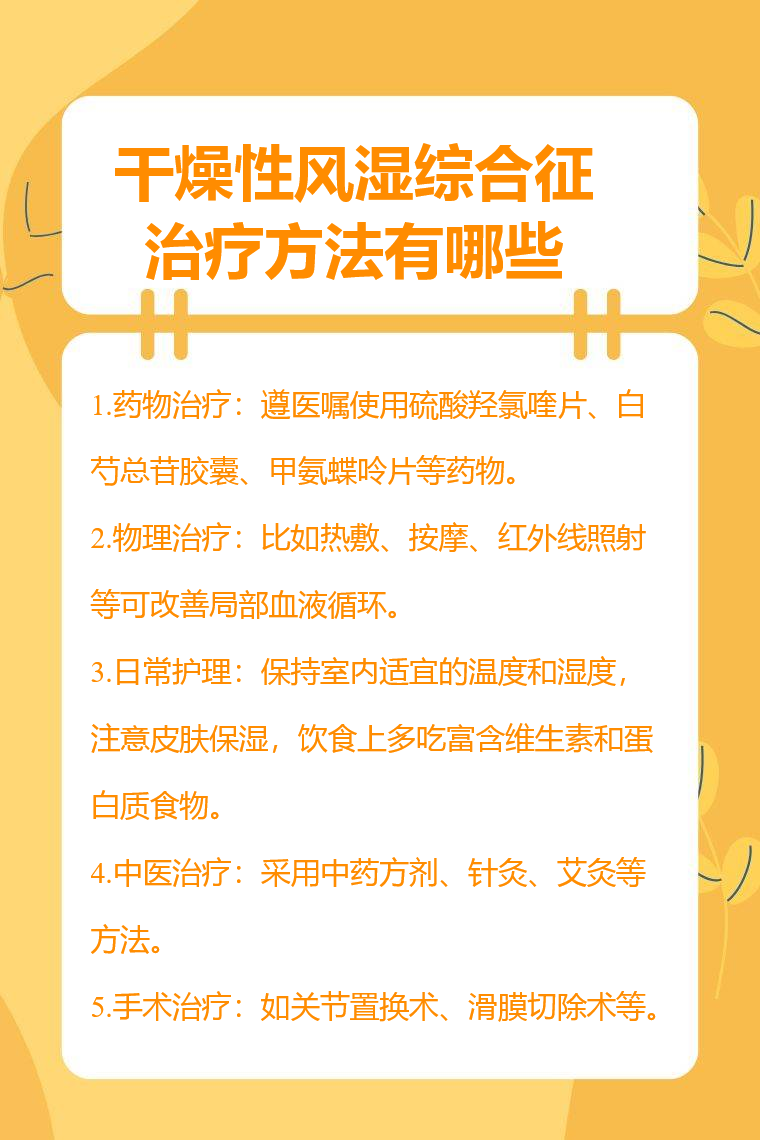乾燥性風濕綜合徵的治療方法有藥物治療、物理治療、日常護理、中醫治療、手術治療等。