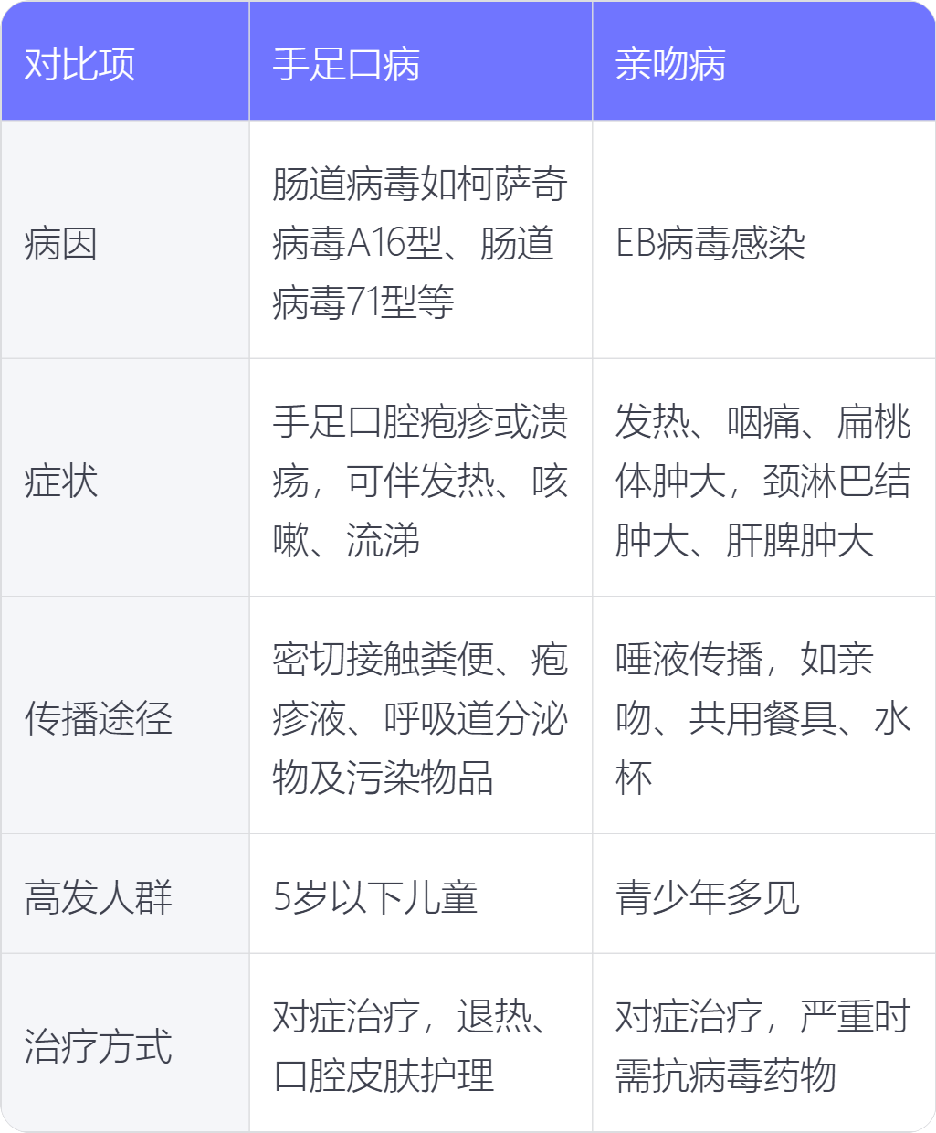4. 高發人群:手足口病主要高發於5歲以下兒童;親吻病雖然可發生於任何年齡,但以青少年多見。