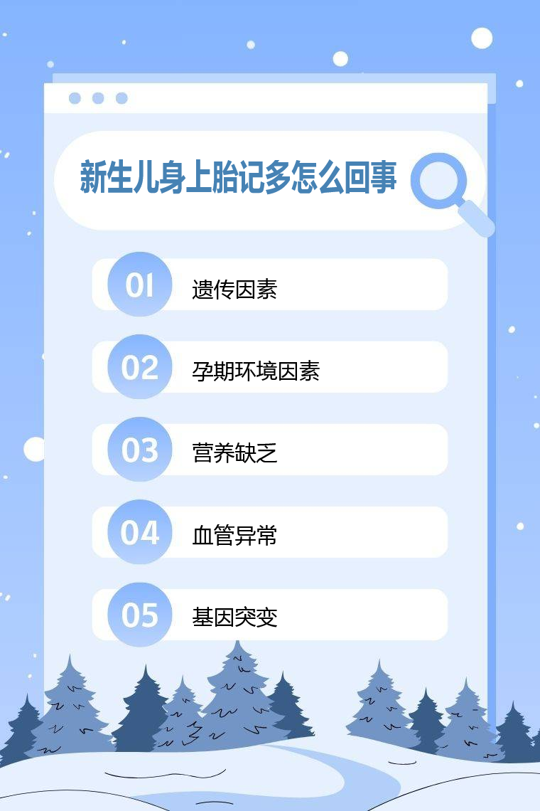 新生兒身上胎記多可能與遺傳因素、孕期環境因素、營養缺乏、血管異常、基因突變等有關。