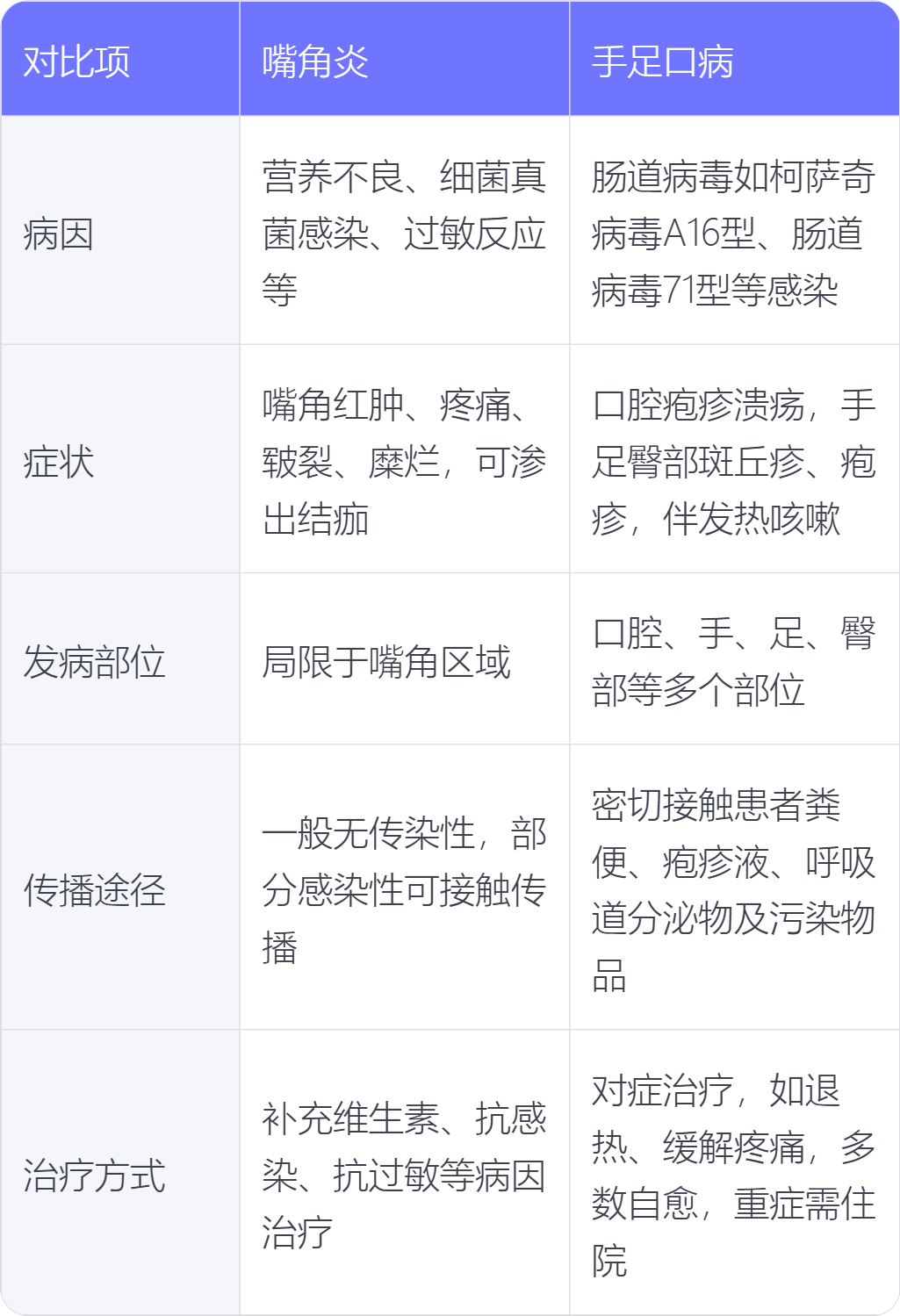 嘴角炎與手足口病在病因、症狀、發病部位、傳播途徑、治療方式上存在不同。