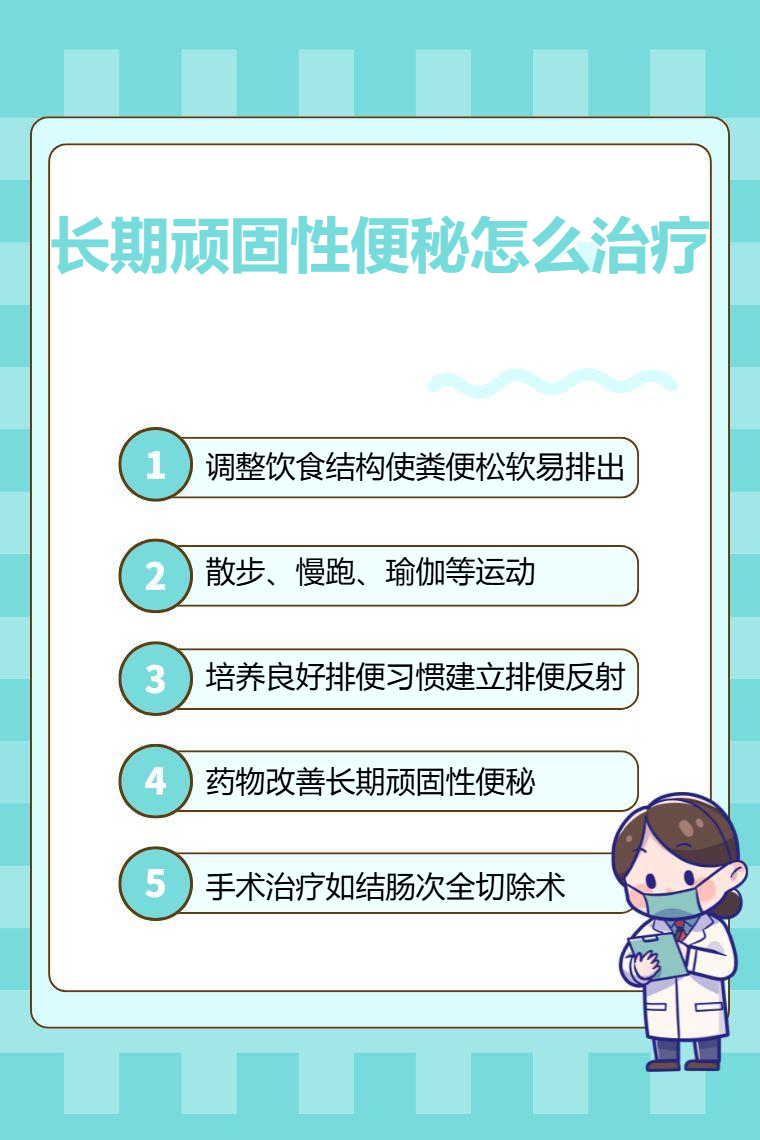 長期頑固性便秘可通過調整飲食結構、增加運動量、培養良好排便習慣、藥物治療、手術治療等方法來應對。