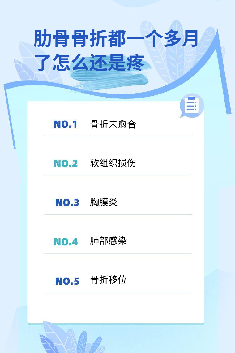 1. 骨折未愈合:肋骨骨折的愈合時間通常需要 3 個月左右,一個多月時骨折斷端可能尚未完全愈合,在活動身體、呼吸等情況下,骨折斷端相互摩擦刺激周圍神經,就會引起疼痛。尤其是一些年齡較大、營養狀況不佳、存在基礎疾病影響骨折愈合的患者,疼痛持續時間可能更長。
