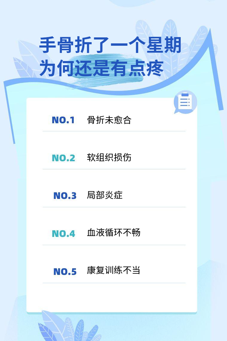 手骨折一個星期仍有點疼可能是骨折未愈合、軟組織損傷、局部炎症、血液循環不暢、康復訓練不當等。