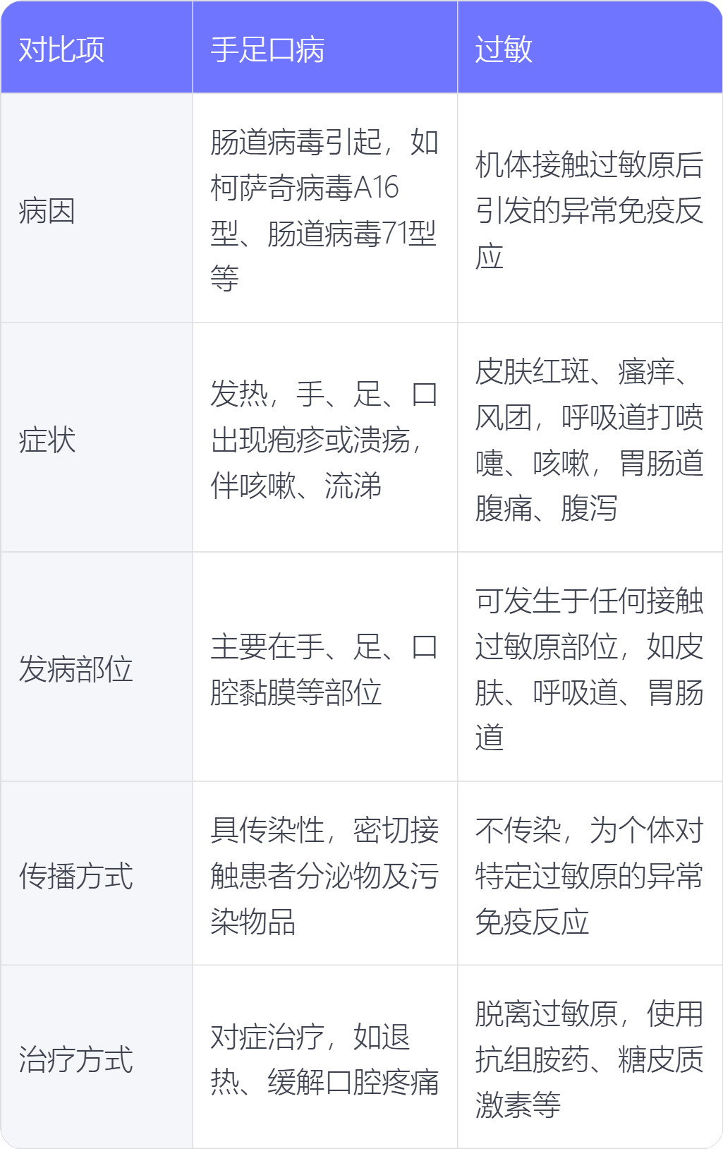 2. 症狀:手足口病通常先出現發熱,隨後手、足、口等部位出現皰疹或潰瘍,部分患者可能伴有咳嗽、流涕、食慾不振等症狀;過敏症狀多樣,皮膚可出現紅斑、瘙癢、風團,呼吸道有打噴嚏、流鼻涕、咳嗽,嚴重時可能出現呼吸困難,胃腸道則表現為腹痛、腹瀉、嘔吐等。