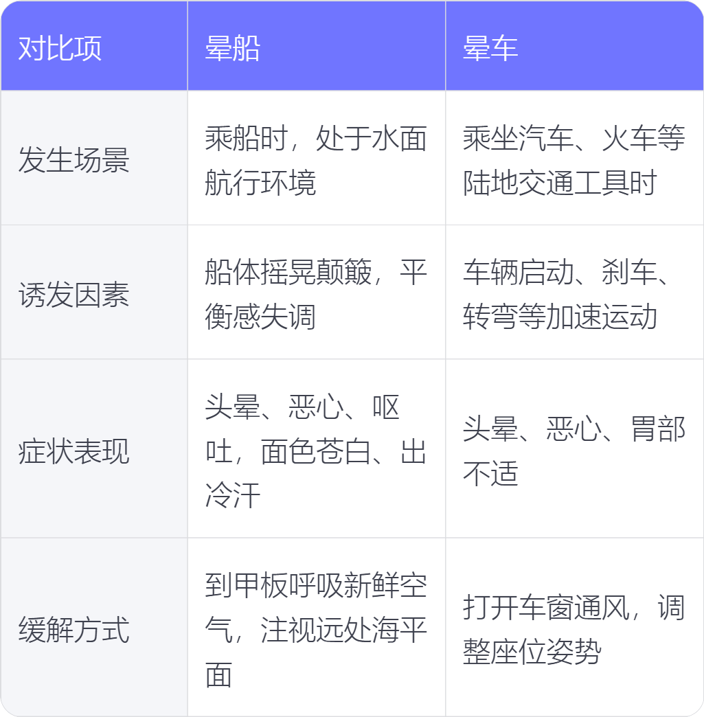 暈船和暈車在發生場景、誘發因素、症狀表現、緩解方式上存在不同。