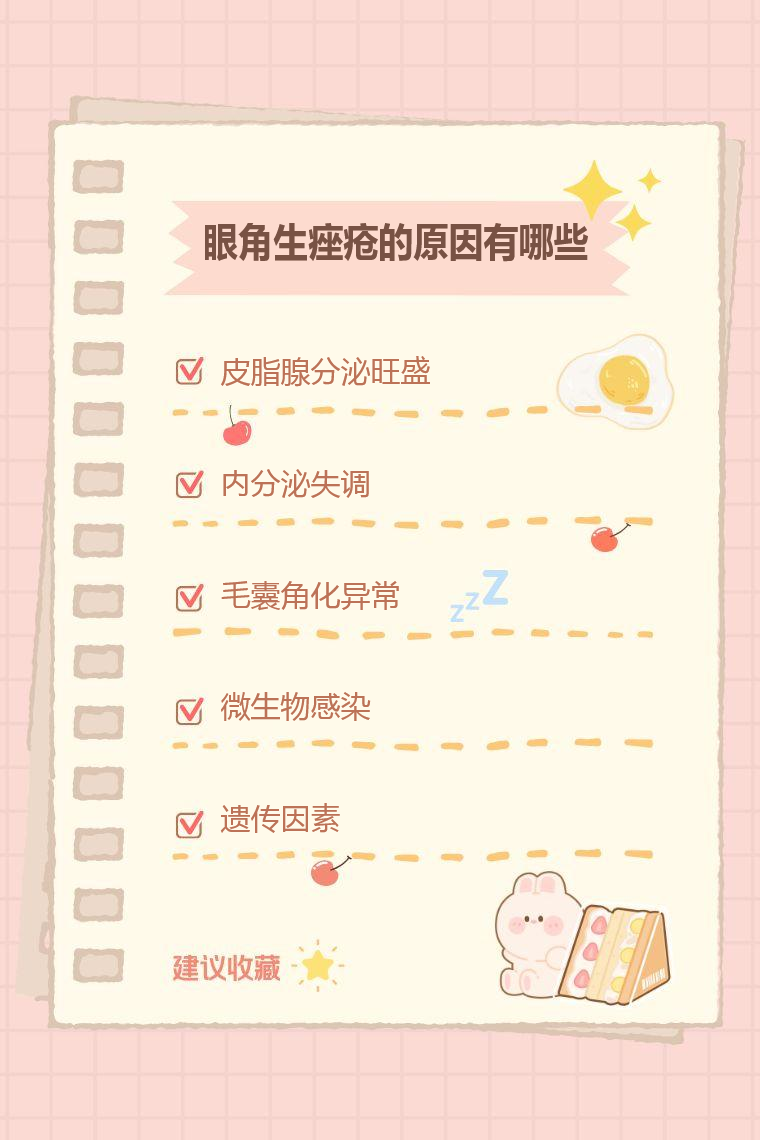 眼角生痤瘡的原因有皮脂腺分泌旺盛、內分泌失調、毛囊角化異常、微生物感染、遺傳因素等。