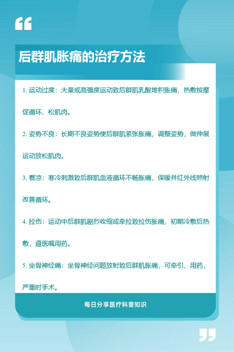 1. 運動過度:因突然進行大量運動或運動強度過大,導致後群肌乳酸堆積,引起脹痛。可通過熱敷,用熱毛巾或熱水袋敷於疼痛部位,每次15 - 20分鐘,每天3 - 4次,促進血液循環,緩解脹痛;還可進行適度按摩,由專業人員輕柔按摩後群肌,放鬆肌肉。