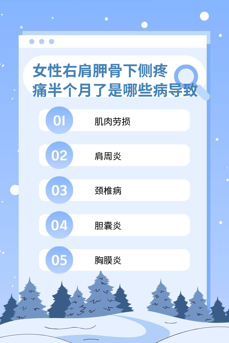 女性右肩胛骨下側疼痛半個月可能由肌肉勞損、肩周炎、頸椎病、膽囊炎、胸膜炎等導致。
