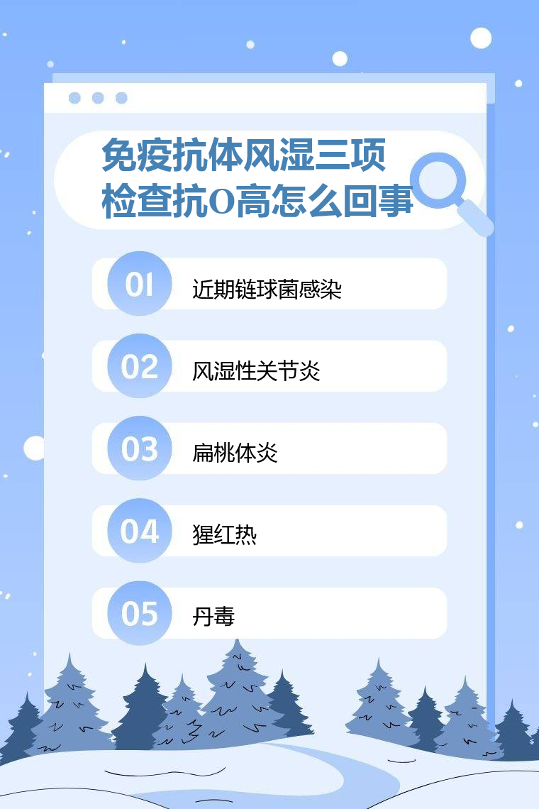 免疫抗體風濕三項檢查抗O高常見於近期鏈球菌感染、風濕性關節炎、扁桃體炎、猩紅熱、丹毒等。