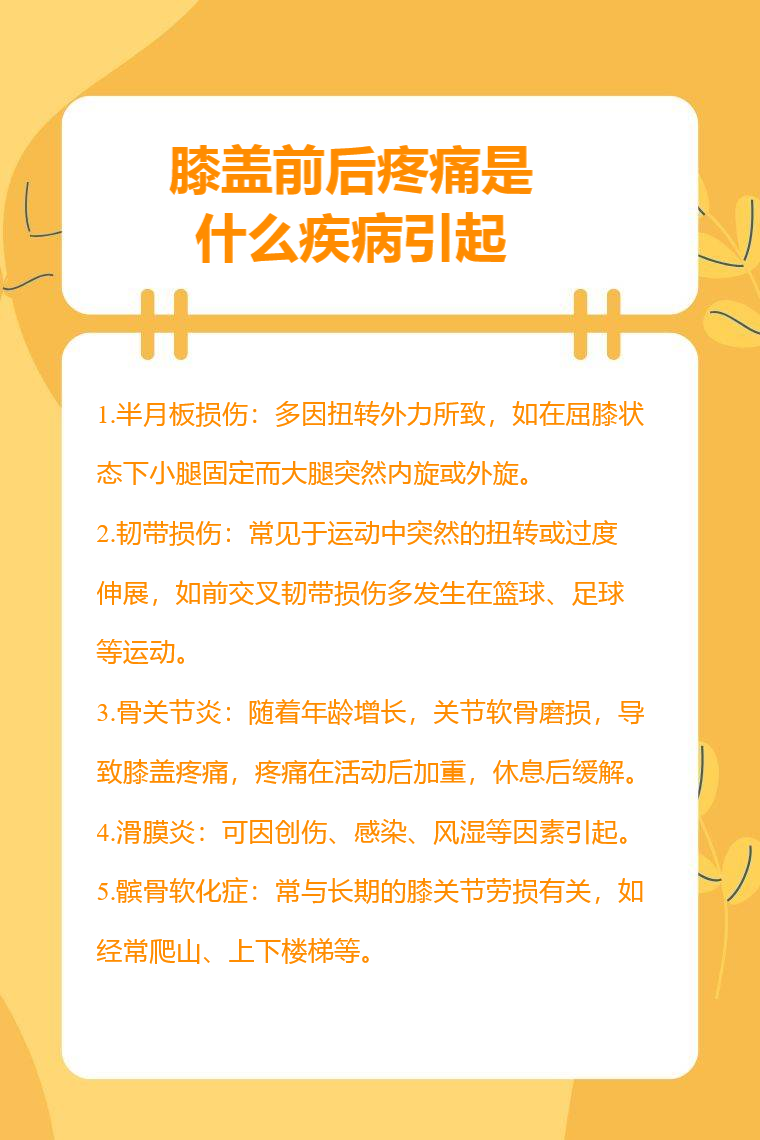 膝蓋前後疼痛可能由半月板損傷、韌帶損傷、骨關節炎、滑膜炎、髕骨軟化症等引起。