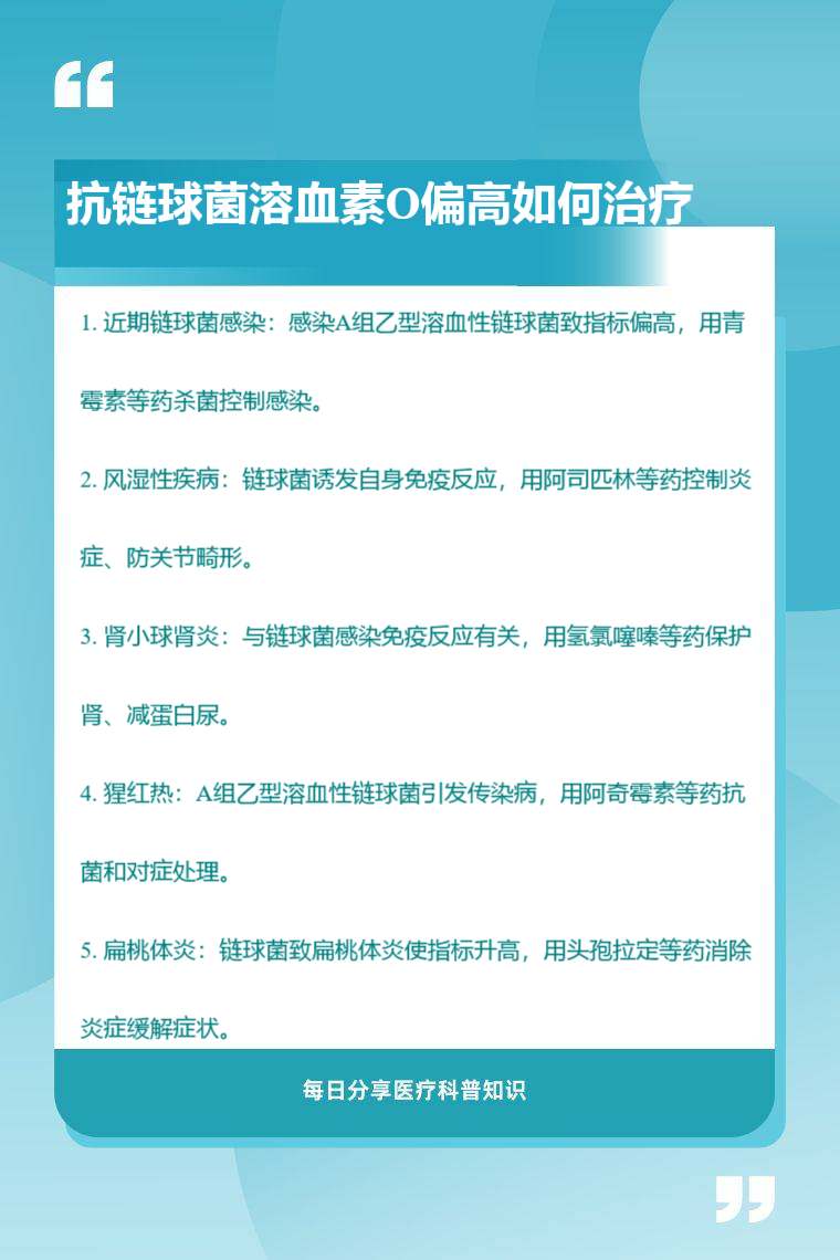 抗鏈球菌溶血素 O 偏高可能是近期鏈球菌感染、風濕性疾病、腎小球腎炎、猩紅熱、扁桃體炎等因素,需要針對病因治療,可採取的方法有使用抗生素、抗風濕藥物等。