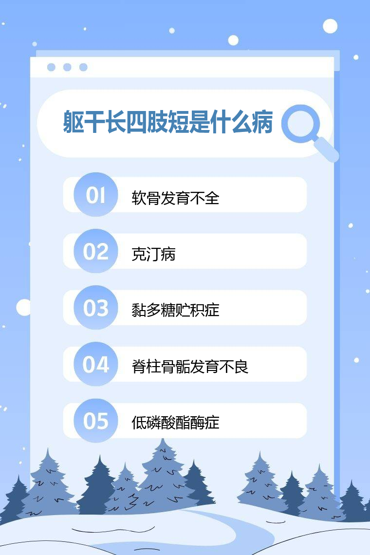 軀乾長四肢短可能是由多種疾病導致,如軟骨發育不全、克汀病、黏多糖貯積症、脊柱骨骺發育不良、低磷酸酯酶症等。