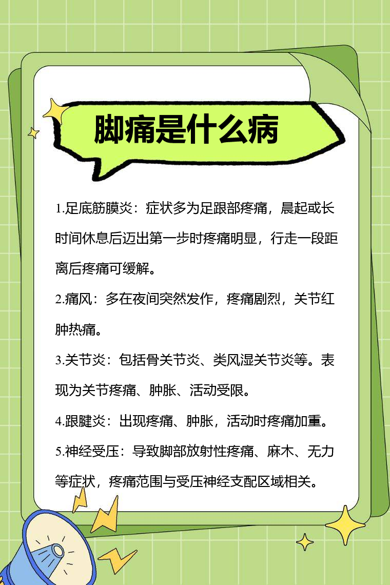 腳痛可能由多種疾病引起,如足底筋膜炎、痛風、關節炎、跟腱炎、神經受壓等。