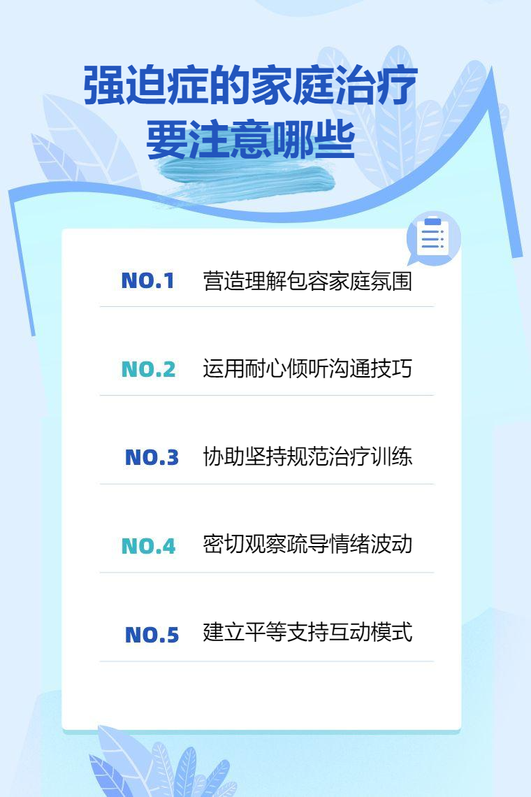 1. 營造理解包容氛圍:家庭成員需充分瞭解強迫症相關知識,明白患者的強迫行為與思維並非出於本意,而是疾病所致。以寬容、接納的態度對待患者,避免指責、批評,為患者創造一個溫暖、安全的家庭環境,讓患者感受到被理解與支持,從而更有勇氣面對疾病。