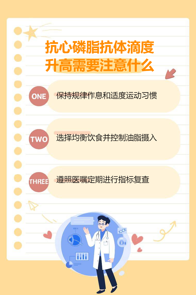 抗心磷脂抗體滴度升高需要注意生活方式、飲食、定期復查等。
