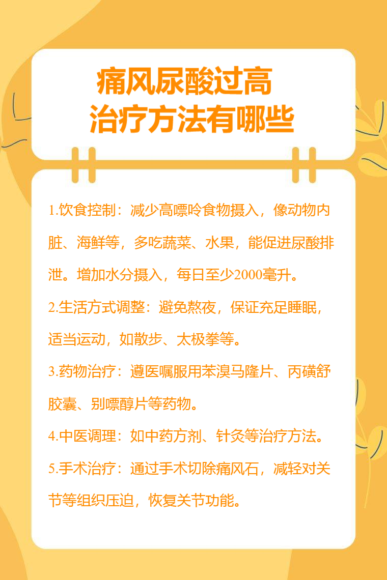 痛風患者尿酸過高的治療方法有飲食控制、生活方式調整、藥物治療、中醫調理、手術治療等。